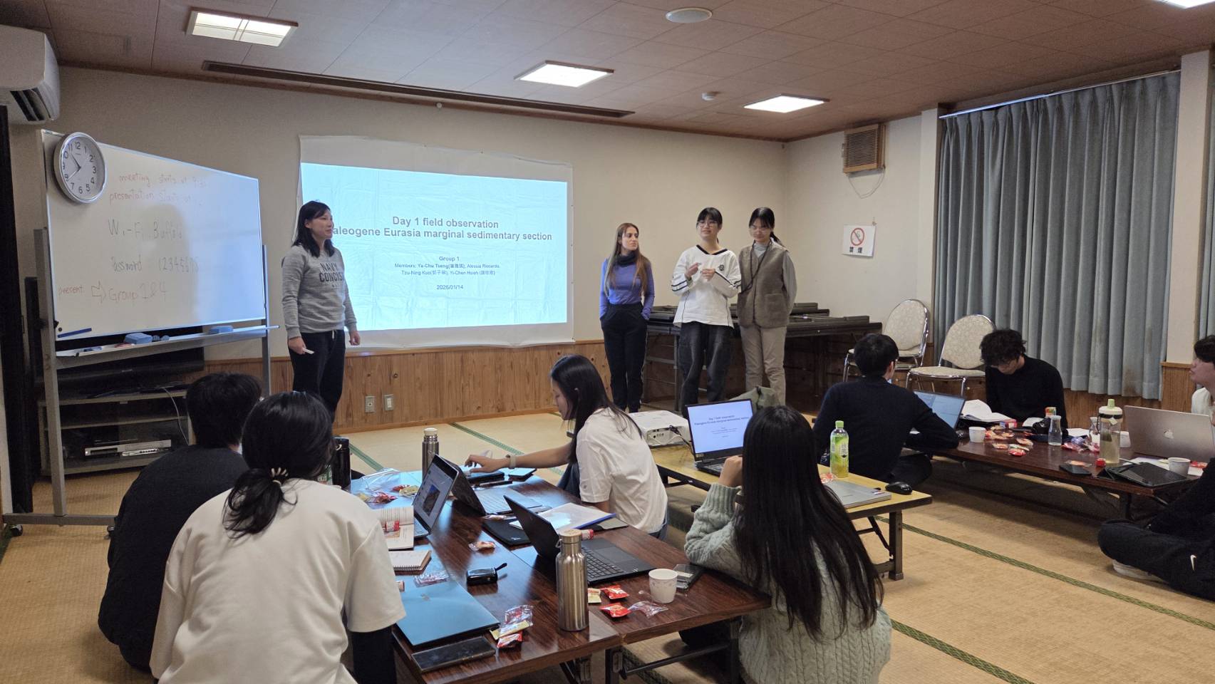 夜の発表会。毎日1日の巡検で学んだことをまとめて発表する。英語で九大学生とともに質疑応答を行う。